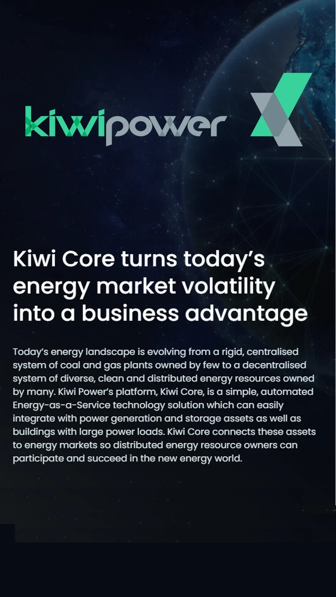 Kiwi Power simplifies participation in power markets across the globe, maximising the value of distributed energy resources. We offer Demand Response Management, Energy Storage Monetisation, Local Grid Management and Wholesale Energy Arbitrage.