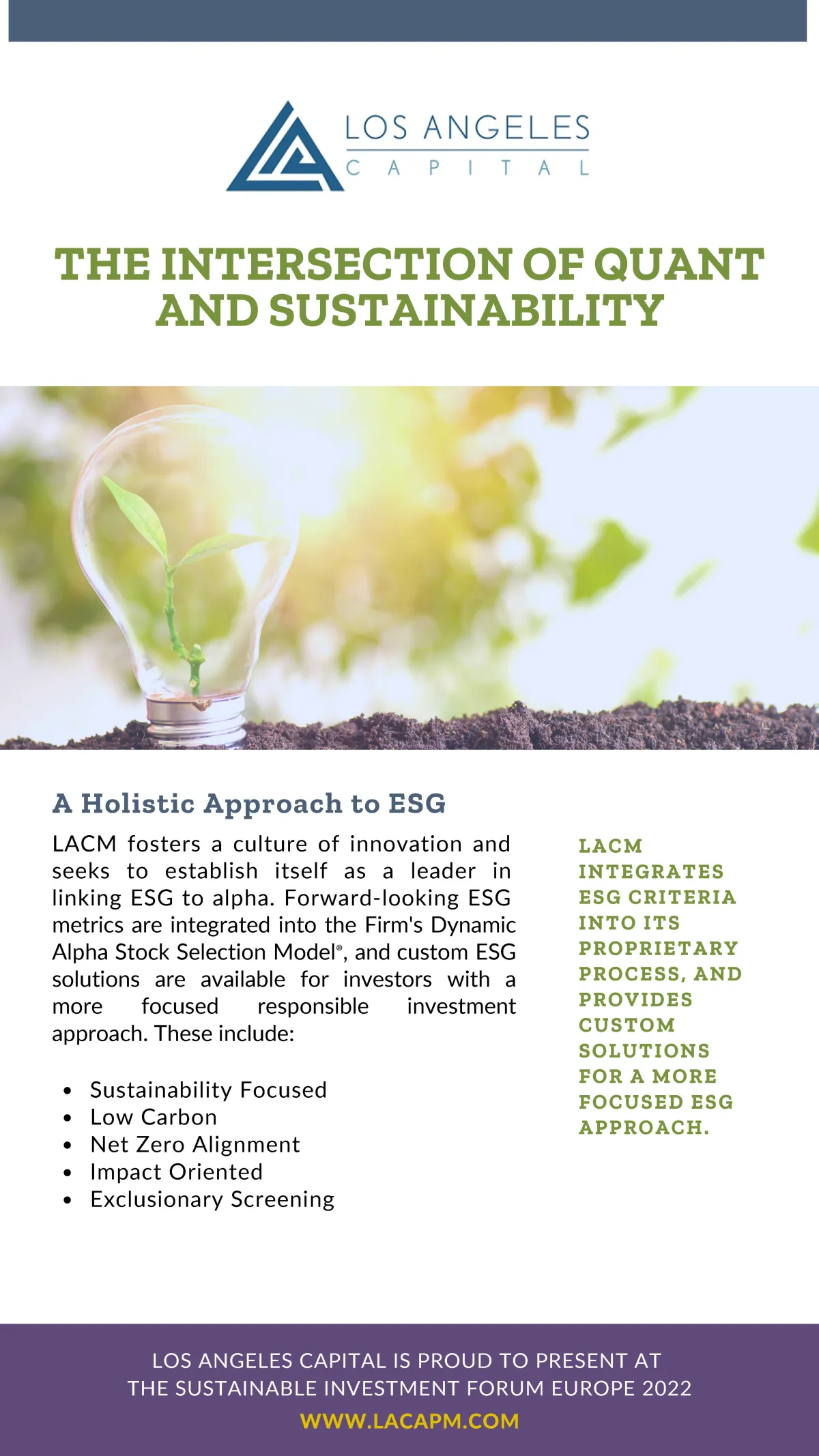 LACM offers a range of strategies and portfolios that adapt to the current economic environment, and with many investors increasingly focused on ESG issues, the Firm’s forward-looking investment process and adaptive Model are designed to capture how evolving metrics related to ESG and sustainability influence a stock’s expected return and risk profile. As well as integrating ESG criteria into its proprietary process, LACM also provides customized solutions for investors seeking a more targeted responsible investment approach.