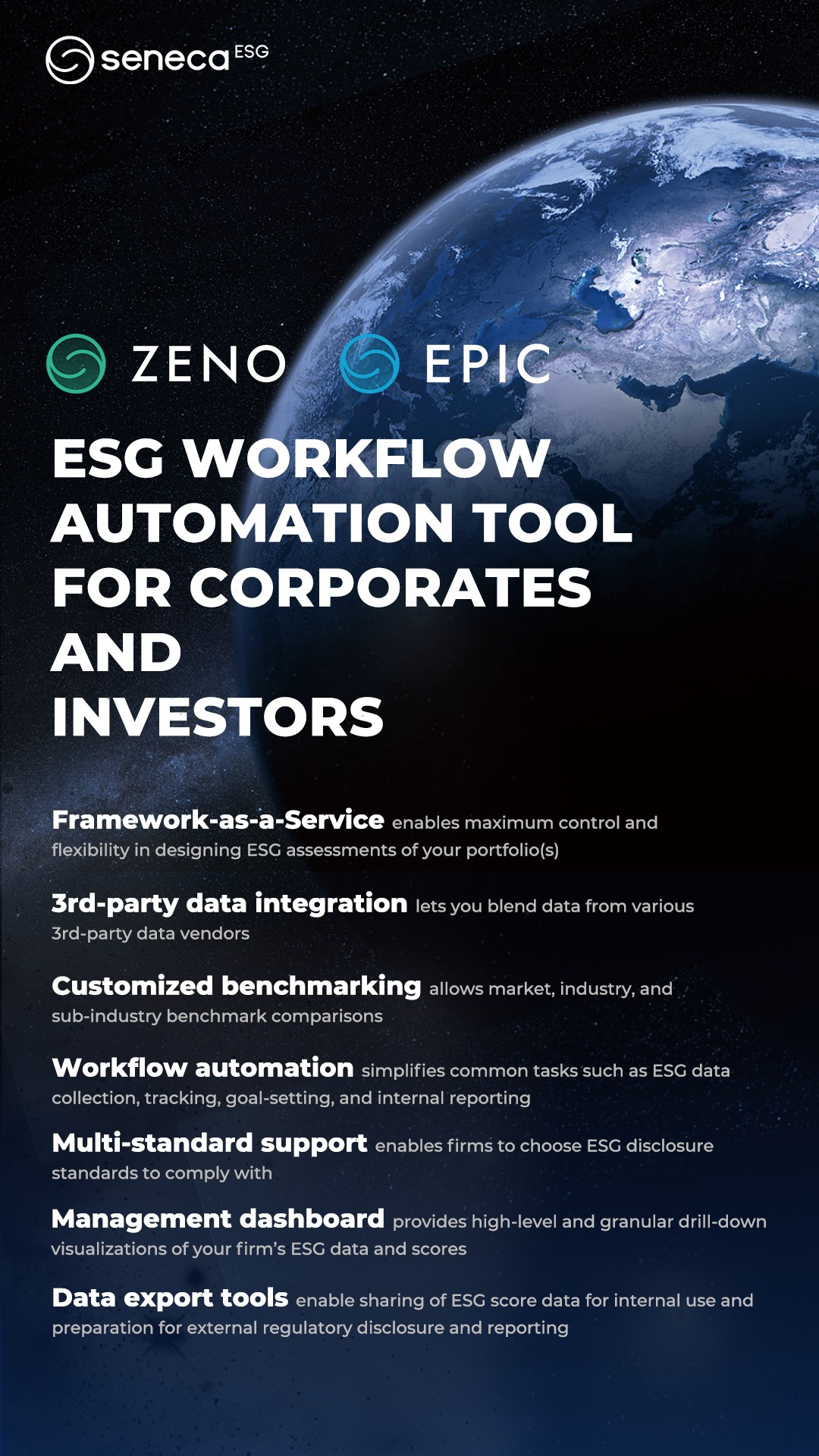 Seneca ESG is a business intelligence company delivering solutions for corporate sustainability assessment, reporting, and integration with financial services. The company’s flagship Zeno/Epic platforms facilitate ESG data management, sustainability-driven analyses, and workflow automation, for both corporate and investment manager clients.