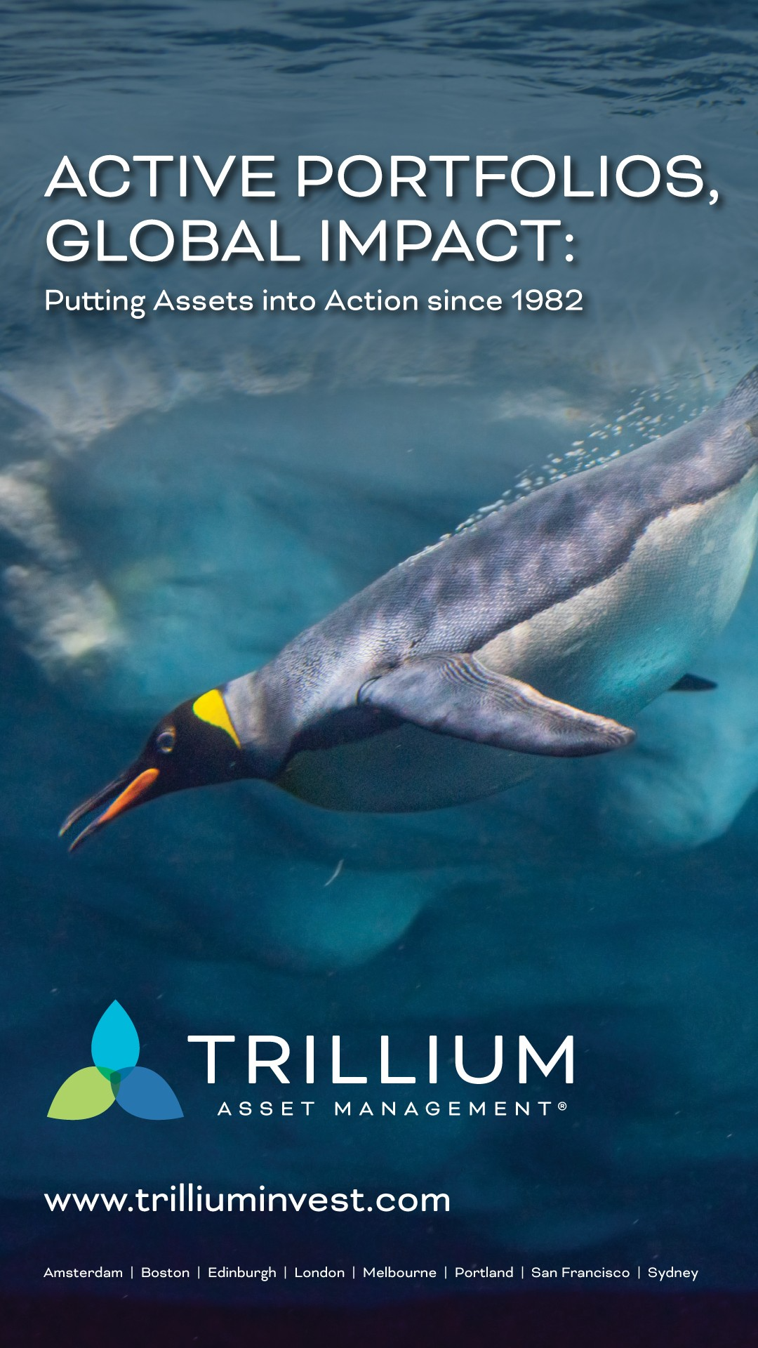 Trillium Asset Management offers investment strategies and services that advance humankind towards a global sustainable economy, a just society, and a better world. For nearly 40 years, the firm has been at the forefront of ESG thought leadership and draws from decades of experience focused exclusively on responsible investing. Trillium uses a holistic, fully integrated fundamental investment process to uncover compelling long-term investment opportunities. Devoted to aligning stakeholders’ values and objectives, Trillium combines impactful investment solutions with active ownership. The firm delivers equity, fixed income, and alternative investments to institutions, intermediaries, high net worth individuals, and other charitable and non-profit organizations with the goal to provide positive impact, long-term value, and ‘social dividends’.